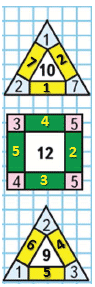 6. В занимательных рамках сумма всех чисел, расположенных вдоль каждой стороны многоугольника, должна быть равна числу, которое записано в центре.
