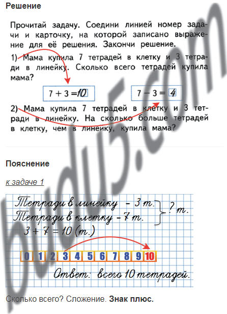 1) Мама купила 7 тетрадей в клетку и 3 тетради в линейку. Сколько всего тетрадей купила мама?
