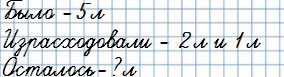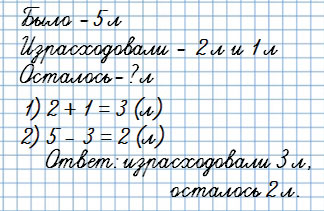 7. В бидоне было 5 л кваса. Для окрошки мама взяла 2 л кваса, и за ужином выпили 1 л. Сколько литров кваса израсходовали? Сколько литров кваса осталось?