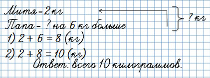 6. Митя нёс из магазина 2 кг моркови, а папа — капусту, масса которой была на 6 кг больше, чем масса моркови. Сколько всего килограммов моркови и капусты они несли?