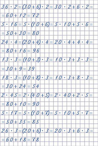 В каждом произведении двузначное число представляем в виде суммы разрядных слагаемых (десятки плюс единицы), затем каждое слагаемое умножаем на однозначное число данное в исходном произведении и складываем полученные результаты.