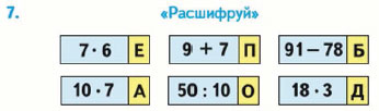 Перепиши записи на карточках в столбик так, чтобы значения выражений шли в таком порядке: 16, 5, 13, 42, 54, 70. Прочитай полученное слово.
