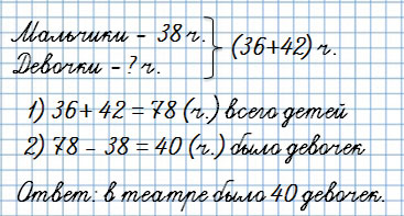 3. В театр поехали 36 первоклассников и 42 второклассника. Из них мальчиков было 38. Сколько девочек поехало в театр?