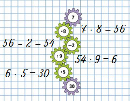 | 7 • 8 - 42 : 7 = 50 1) 7 • 8 = 56 2) 42 : 7 = 6 3) 56 - 6 = 50 | 50 - 21 : 3 = 43 1) 21 : 3 = 7 2) 50 - 7 = 43 |