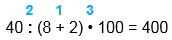 | 40 : (8 + 2) • 100 | (100 - 40 + 36) : 4 |