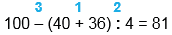 1) 40 + 36 = 76 2) 76 : 4 = 40 : 4 + 36 : 4 = 10 + 9 = 19 3) 100 - 19 = 81 |