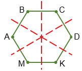 Все ли оси симметрии этой фигуры он провел? Запиши названия тех отрезков, которые будут осями симметрии шестиугольника АВСDKM и которых нет на чертеже.