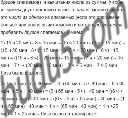 Лиза была в школе с 8 ч 15 мин до 15 ч 20 мин. Вечером она пошла на тренировку. Там она провела на 5 ч 40 мин меньше времени, чем в школе. Сколько времени Лиза была на тренировке?