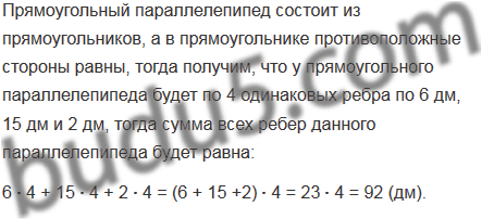 Объем прямоугольного параллелепипеда равен 180 дм3, а два его измерения - 6 дм и 15 дм. Найдите сумму длин всех ребер параллелепипеда.