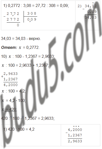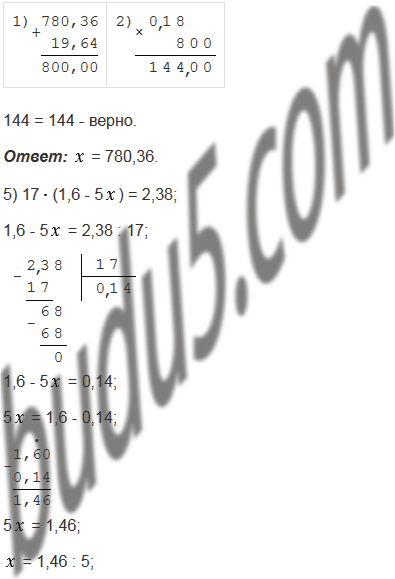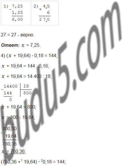 4) ( + 19,64)0,18 = 144;         10) : 100 - 1,2367 = 2,9633;