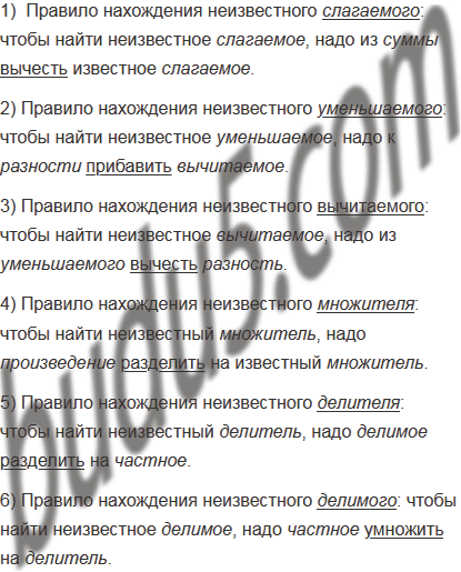 6. Правила нахождения неизвестного слагаемого, уменьшаемого, вычитаемого, множителя, делимого и делителя.
