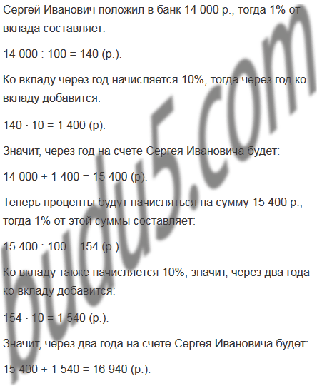Сергей Иванович положил в банк 14 000 р. под 10% годовых. Какая сумма будет на его счете через год? Через два года?