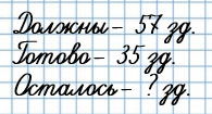 2) Строители должны построить 57 зданий. Готово 35 зданий. Сколько зданий осталось построить?