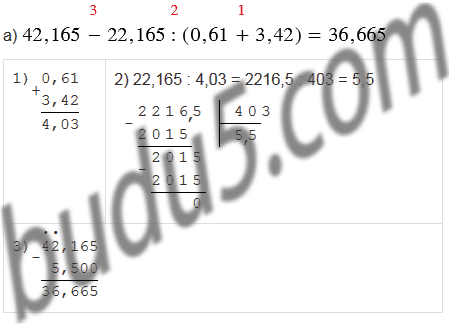 а) 42,165 - 22,165 : (0,61 + 3,42);