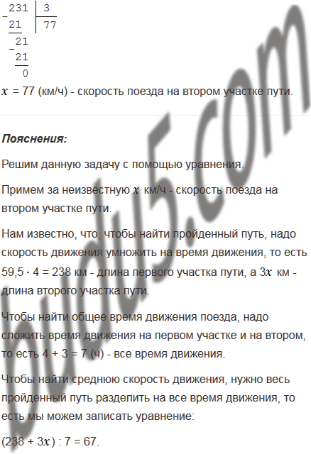 Пассажирский поезд прошёл путь от одной станции до другой со средней скоростью 67 км/ч. Вначале он шёл 4 ч со скоростью 59,5 км/ч, а затем увеличил скорость и прибыл на вторую станцию через 3 ч. Найдите скорость поезда на втором участке пути.