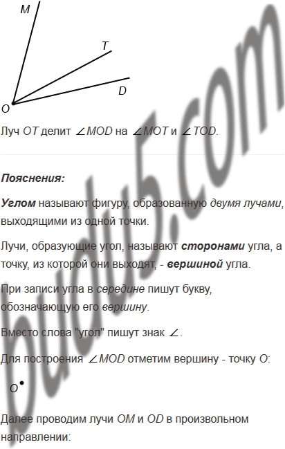 Начертите угол MOD и проведите внутри него луч OT. Назовите и обозначьте углы, на которые этот луч делит угол MOD.