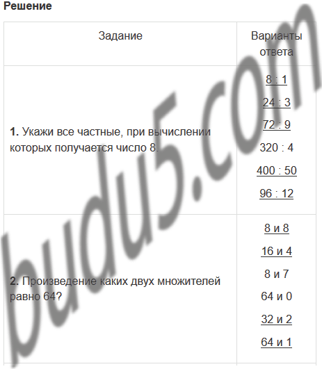 | 1. Укажи все частные, при вычислении которых получается число 8. | 8 : 1 24 : 3 72 : 9 320 : 4 400 : 50 96 : 12 |