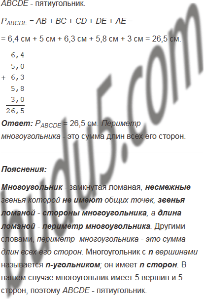 Стороны многоугольника ABCDE равны: АВ = 6,4 см, ВС = 5 см, CD = 6,3 см, DE = 5,8 см и АЕ = 3 см. Найдите периметр этого многоугольника. Как называется такой многоугольник? Что такое периметр многоугольника?