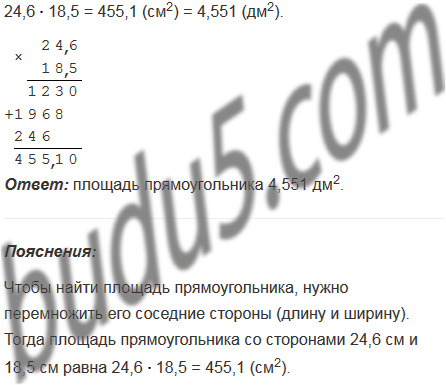 Найдите площадь прямоугольника, стороны которого равны 24,6 см и 18,5 см. Выразите площадь в квадратных дециметрах.