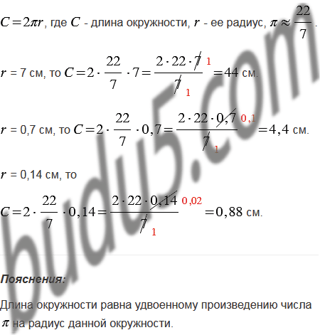 Найдите длину окружности, радиус которой 7 см; 0,7 см; 0,14 см, приняв .