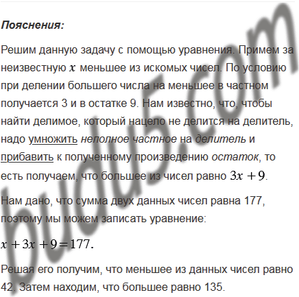 Сумма двух чисел - 177. При делении большего из них на меньшее в частном получается 3 и в остатке 9. Найдите эти числа.