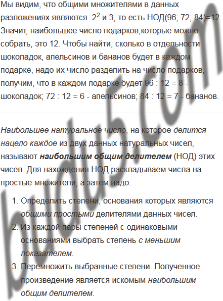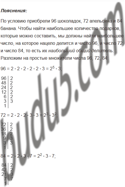 Для новогодних подарков приобрели 96 шоколадок, 72 апельсина и 84 банана. Какое наибольшее количество подарков можно из них составить, если необходимо использовать все продукты? Сколько в отдельности шоколадок, апельсинов и бананов будет в каждом подарке?