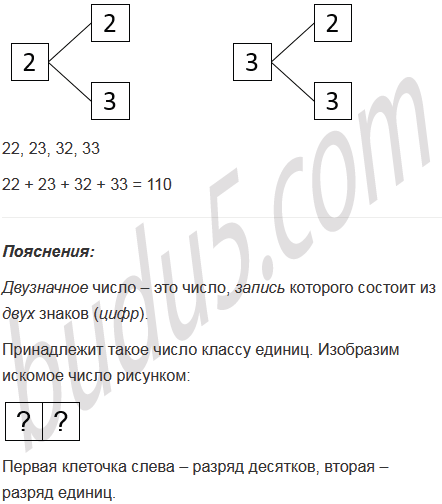 Составьте дерево возможных вариантов и запишите все двузначные числа, в запись которых входят лишь цифры 2 и 3. Найдите сумму этих чисел.