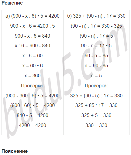 | а) (900 - х : 6) • 5 = 4200 | б) 325 + (90 - n) : 17 = 330 |