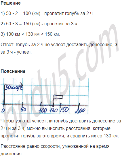 Задание № 9. Почтовый голубь должен доставить донесение на расстояние 130 км. Скорость голубя 50 км/ч. Успеет ли он доставить это донесение: а) за 2 часа? б) за 3 часа?
