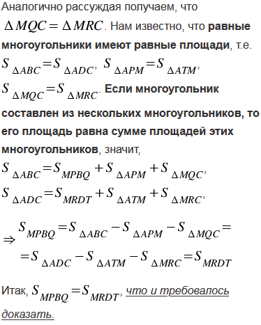 Через точку М, лежащую внутри параллелограмма ABCD, проведены прямые, параллельные его сторонам и пересекающиеся сторона АВ, ВС, CD и DA соответственно в точках Р, Q, R и Т. Докажите, что если точка М лежит на диагонали АС, то площади параллелограммов MPBQ и MRDT равны и, обратно, если площади параллелограммов MPBQ и MRDT равны, то точка М лежит на диагонали АС.