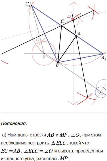 б) по углу, высоте, проведённой из вершины данного угла, и периметру.