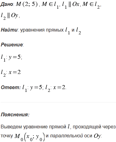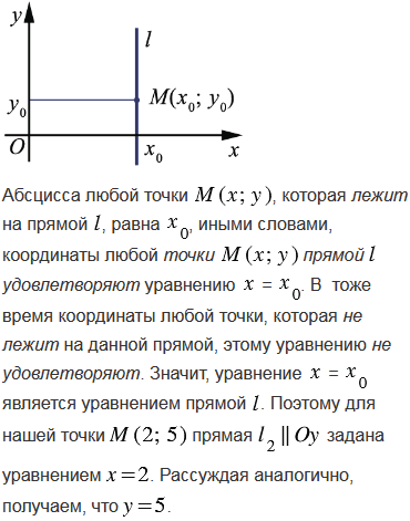 Напишите уравнения прямых, проходящих через точку М(2; 5) и параллельных осям координат.
