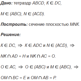 Изобразите тетраэдр DАВС, отметьте точку К на ребре DC и точки М и N граней АВС и АСD. Постройте сечение тетраэдра плоскостью МNК.
