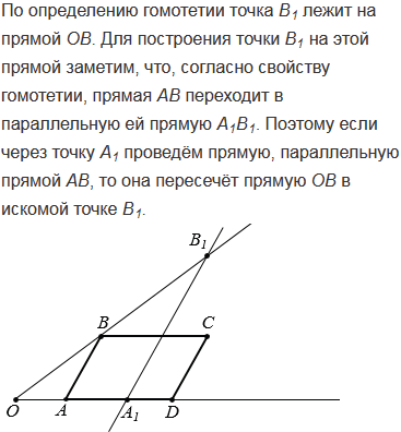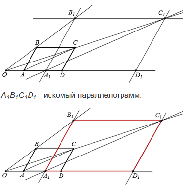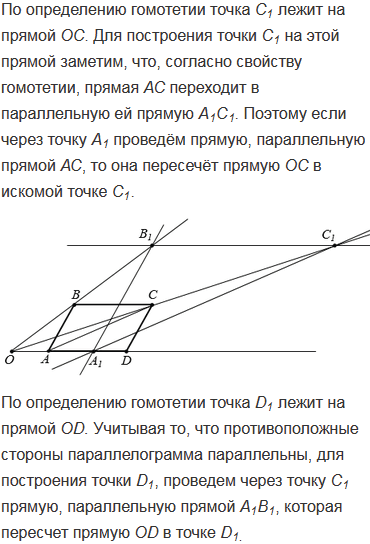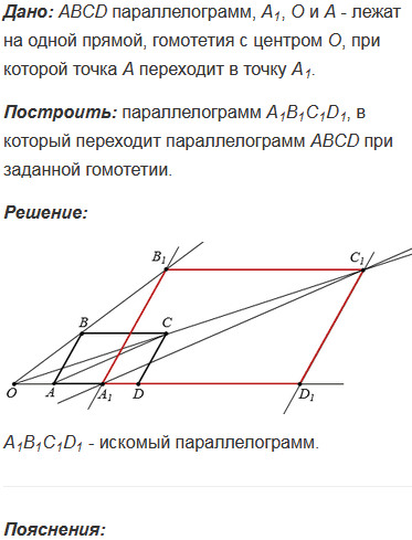 Начертите параллелограмм АВСD отметьте на плоскости точки О и А1 так, чтобы А1, О и А лежали на одной прямой. Рассмотрите гомотетию с центром в точке О, при котором точка А переходит в точку А1. Используя свойства гомотетии, постройте параллелограмм А1В1С1D1, в которой переходит параллелограмм АВСD при заданной гомотетии.