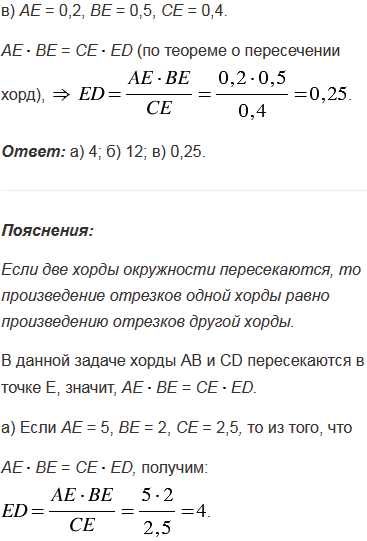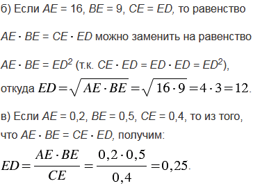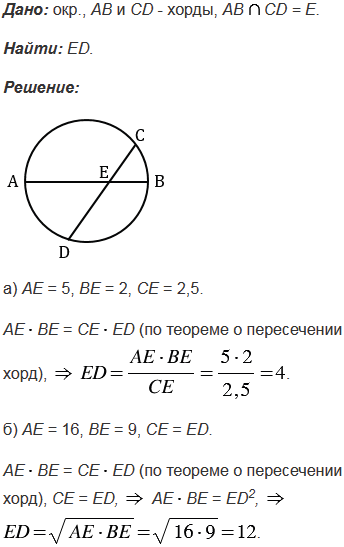 Хорды АВ и СD пересекаются в точке Е. Найдите ЕD, если: а) АЕ = 5, ВЕ = 2, СЕ = 2,5; б) АЕ = 16, ВЕ = 9, СЕ = ЕD; в) АЕ = 0,2, ВЕ = 0,5, СЕ = 0,4.