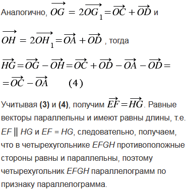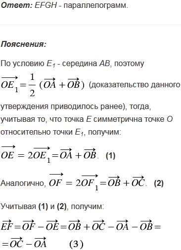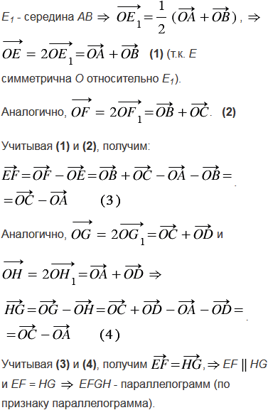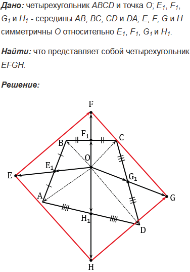 Даны четырехугольник АВСD и точка О. Точки Е, F, G и Н симметричны точке О относительно середин сторон АВ, ВС, СD и DА соответственно. Что представляет собой четырехугольник ЕFGH.