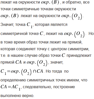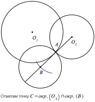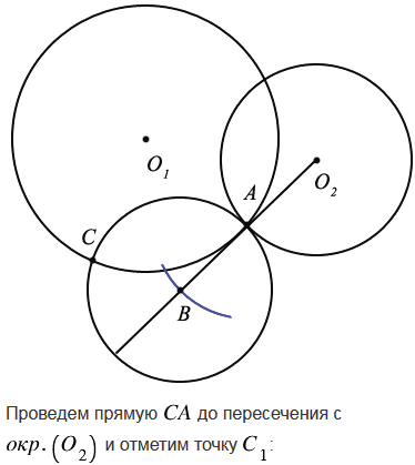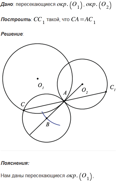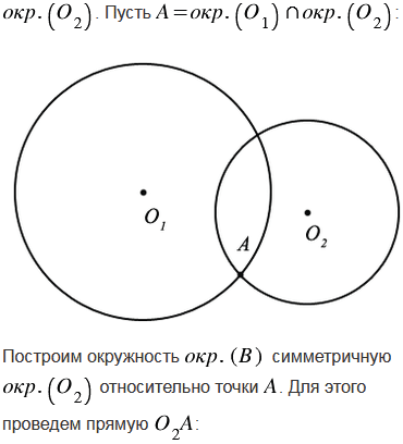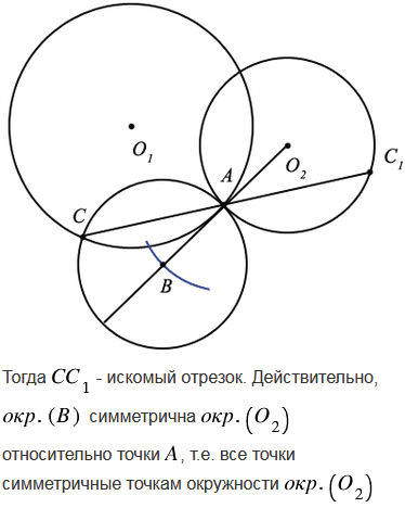 Даны две пересекающиеся окружности. Постройте отрезок, концы которого лежат соответственно на данных окружностях, а его середина совпадает с одной из точек пересечения данных окружностей.