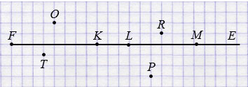 Отметьте точки K, L и М, лежащие на луче FE, и точки О, Р, R и Т, не лежащие на этом луче.