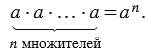 Степенью числа "" с натуральным показателем "n", большим 1, называется произведение "n" одинаковых множителей, каждый из которых равен числу "".
