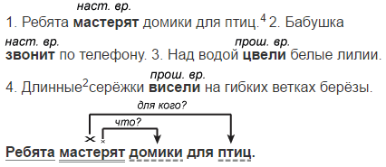 1. Ребята (мастерить) домики для птиц.4 2. Бабушка (звонить) по телефону. 3. Над водой (цвести) белые лилии. 4. Длинные2 серёжки (висеть) на гибких ветках берёзы.