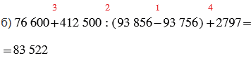 б) 76 600 + 412 500 : (93 856 - 93 756) + 2797;