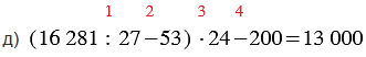 д) (16 281 : 27 - 53) • 24 - 200;