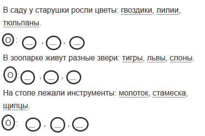 1) В саду у старушки росли цветы гвоздики лилии тюльпаны. 2) В зоопарке живут разные звери тигры львы слоны. 3) На столе лежали инструменты молоток стамеска щипцы.
